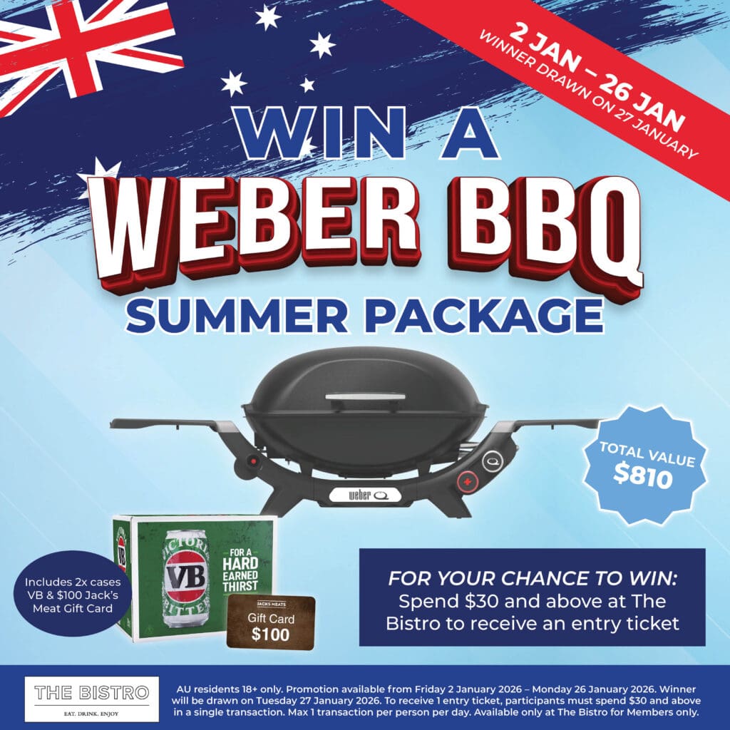 From Friday 2 January to Monday 26 January, Members can earn entries into our January draw when spending on food and beverages at The Bistro. The lucky winner will be drawn on Tuesday 27 January.